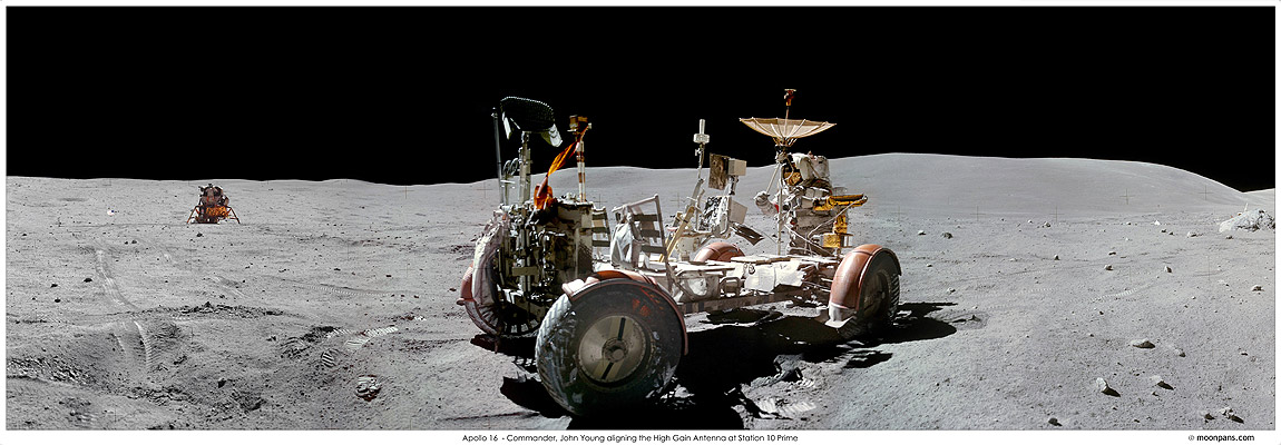 Shows Apollo 16 Commander John Young at Station 10 aligning the High Gain Antenna to point at Earth