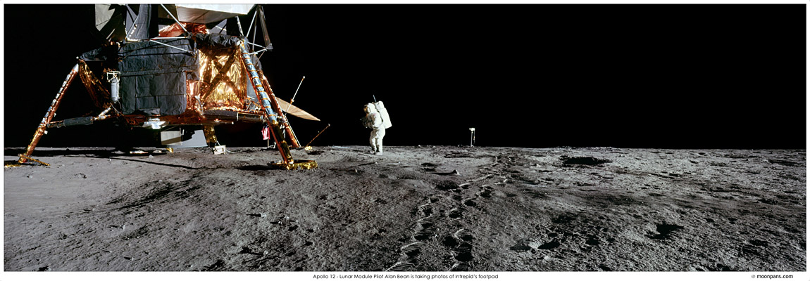 Shows Alan Bean taking photos of LM Intrepid's footpads to record how deep they penetrated the Lunar Surface