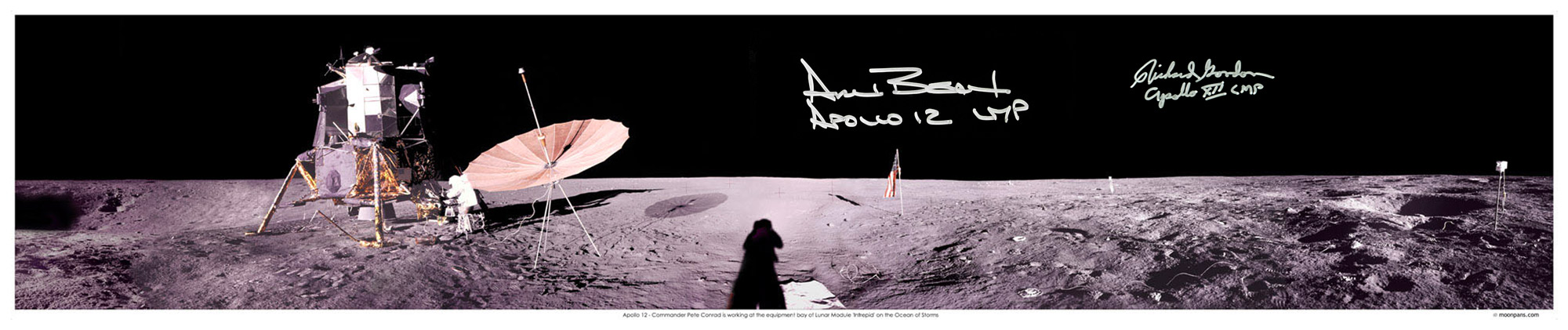 40x8 inch panorama of the Apollo 12 Landing site, hand signed in silver pen "Alan Bean Apollo 12 LMP" and "Richard Gordon Apollo XII CMP"