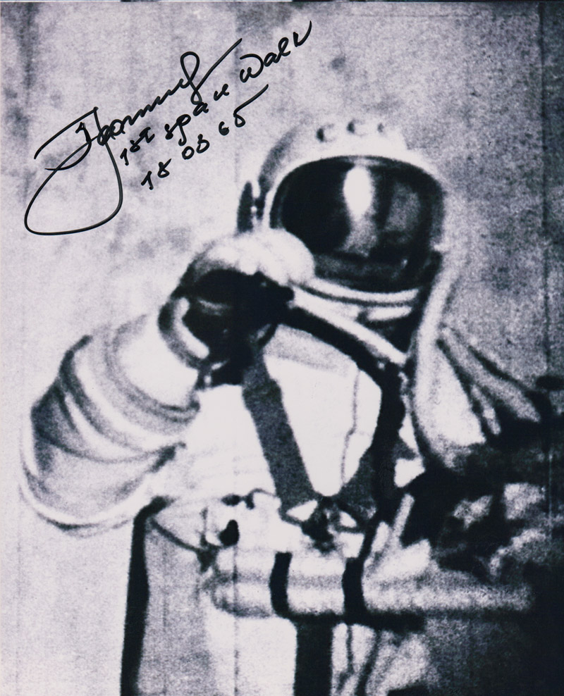 This 8x10 inch photo of Leonov performing the first ever spacewalk has been hand signed by Alexei Leonov in bold black pen with 'A Leonov - 1st Space Walk - 18-03-65'