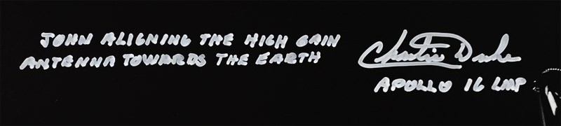 23x8 inch panorama showing John Young at Station 10, hand signed and inscribed in bold silver pen, "John Aligning the High Gain Antenna Towards the Earth - Charlie Duke Apollo 16 LMP"