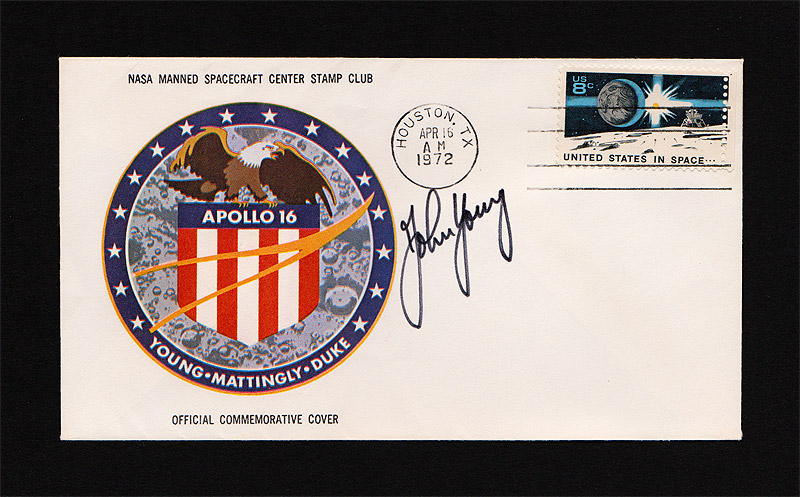 John Young signed insurance cover with a cachet of the mission insignia, bearing an April 16, 1972, Kennedy Space Center launch date postmark, signed boldly in black felt tip on the front before the launch by John Young and also on the rear in ballpoint along with the printed text, "Original Apollo 16 Insurance Cover. Pre-launch signed on obverse from my Personal Collection - John Young"