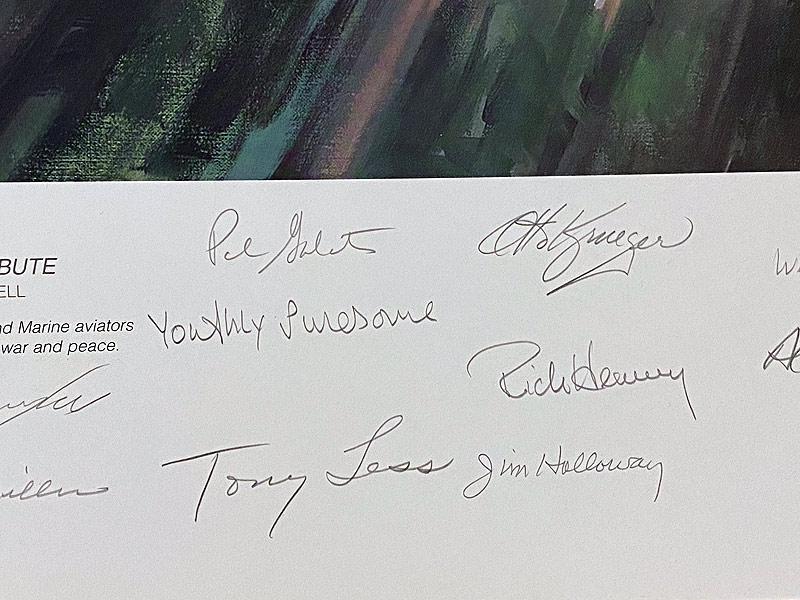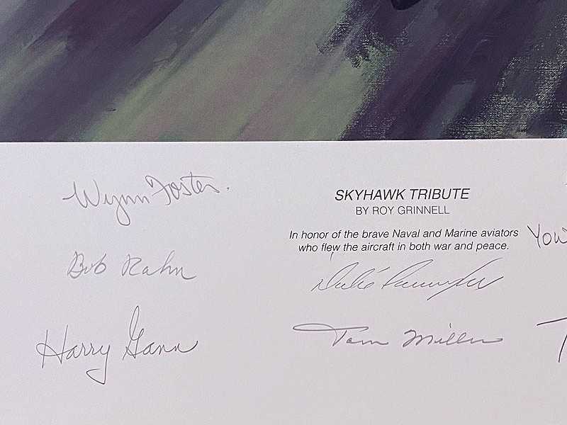 32 x 25 inch color limited edition lithograph of a painting by Roy Grinnell entitled ‘Skyhawk Tribute' depicting the Douglas A-4 Skyhawk in action, hand signed in pencil by 23 Naval and Marine Aviators, as follows:
