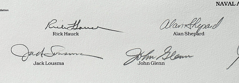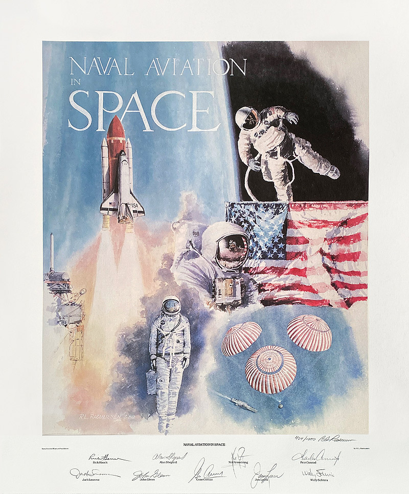 26 x 29 inch color limited edition lithograph of a painting entitled ‘Naval Aviation in Space' signed in pencil by nine astronauts, all former Naval aviators, representing all of NASA’s space programs.