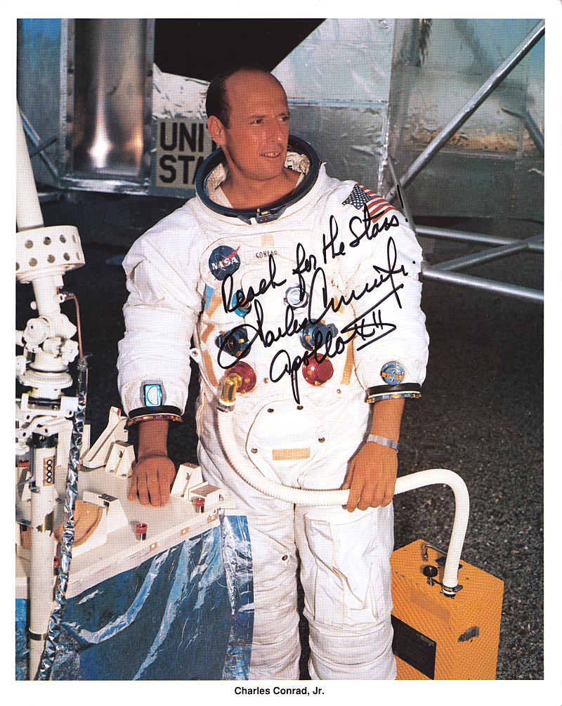 Hand signed by Charles Conrad with "Reach For The Stars!"