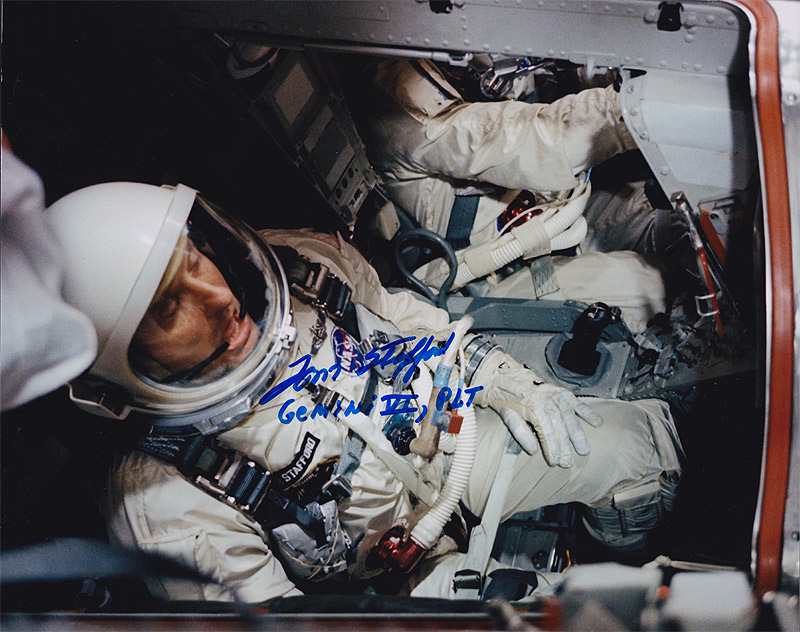 8x10 photo showing Stafford strapped into the Gemini 6A space craft. Hand signed by Stafford in blue sharpie with 'Gemini VI PLT'